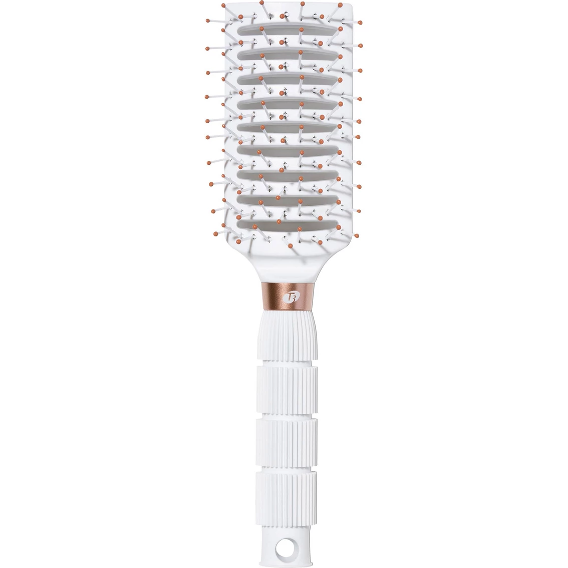 Designed with a vented body, this professional styling brush from T3 allows air to circulate freely for fast blow drying. Its widely spread, heat-resistant bristles detangle and gently smooth hair. Its soft, no-slip handle ensures better control and effortless styling. Ideal for all hair types. Model: 83658.